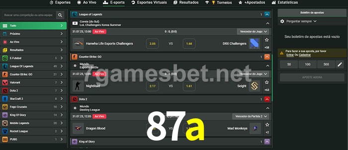 O 87a oferece uma grande seleção de opções de apostas em e-sports com probabilidades competitivas